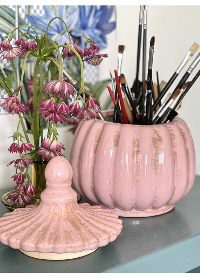 Kurpitsa keraaminen ruukku kannella vaaleanpunainen