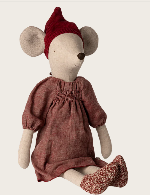 Suloinen Mailegin jouluinen tyttöhiiri punaisessa mekossaan ja hiippalakissaan.