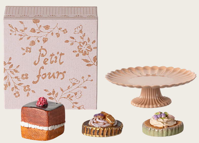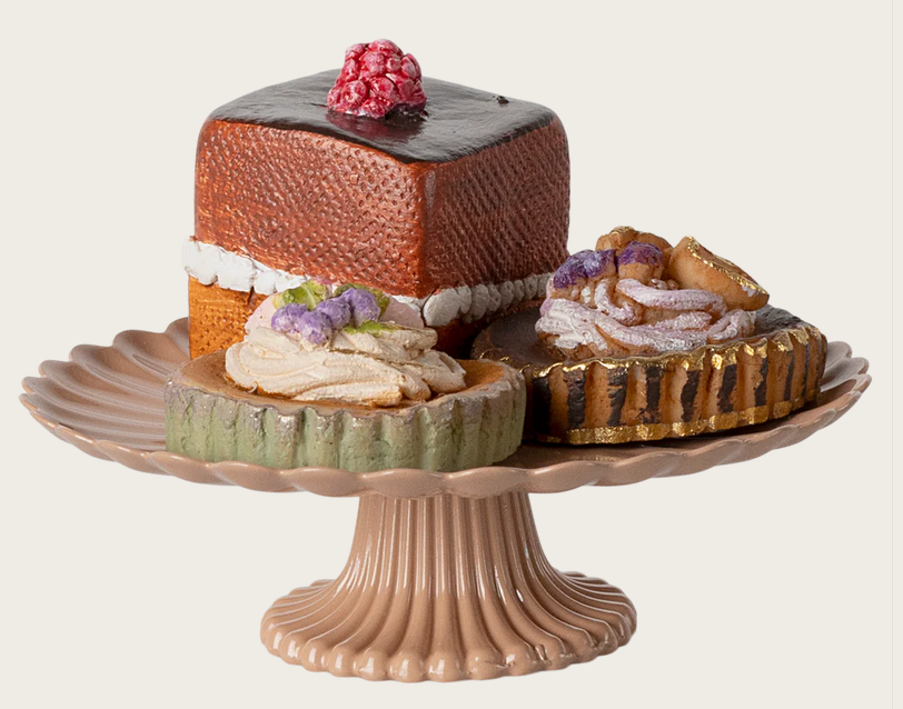 Pakkaus sisältää kolme leivonnaista ja kakkutarjottimen.