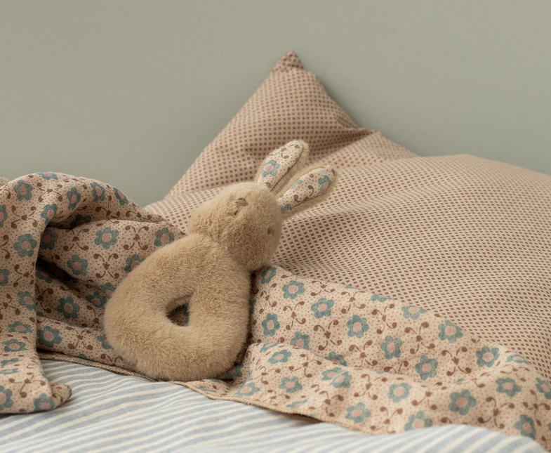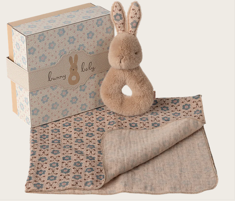 Kaunis Mailegin lahjapakkaus sisältää kauniissa rasiassa pehmeän pupuhelistimen ja unirievun.