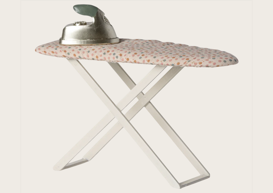 Maileg silityslauta ja rauta. Silityslaudassa kaunis pilkullinen kangas.