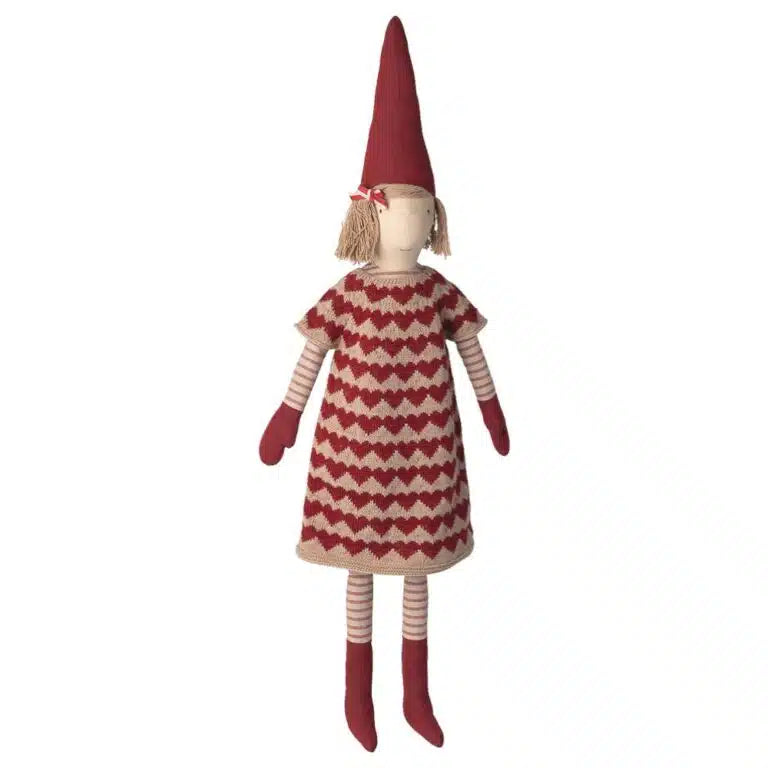 Suloinen Mailegin Nissetyttö sydämin koristelussa neulemekossaan.