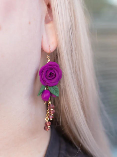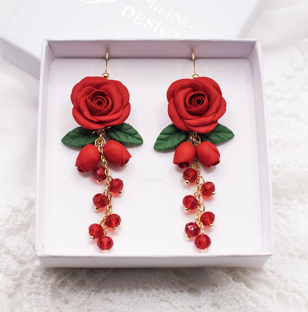 Kauniit ruusun muotoiset kukkakorvakorut. Koruissa on riipuksina fasettihiottuja lasihelmiä, jotka heijastavat kauniisti valoa. Upea punainen sävy toistuu kukissa ja helmissä.